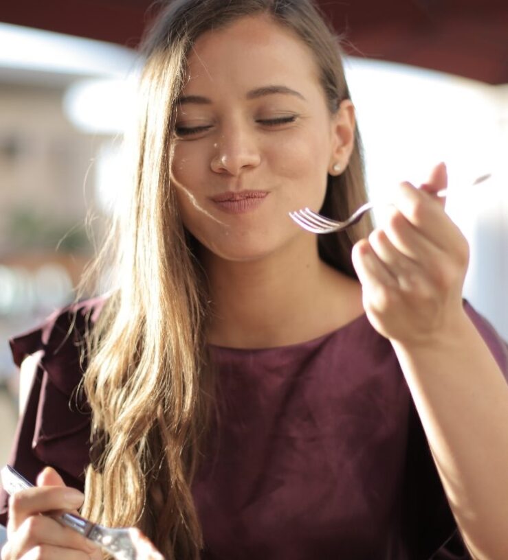 Putting down cutlery between mouthfuls encourages a slower natural eating rhythm and allows the brain’s fullness signals (which take around 15–20 minutes) to kick in. This also reduces overeating and helps maintain steadier stomach pressure.