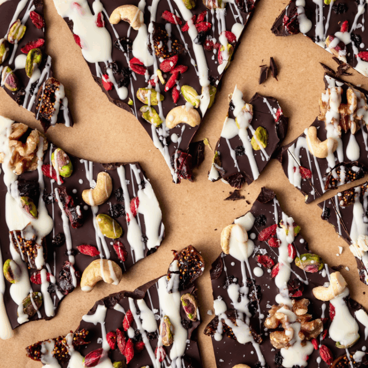 Rich, crunchy, and bursting with antioxidants, this chocolate bark blends dark chocolate with colourful nuts and fruits for a feel-good snack.