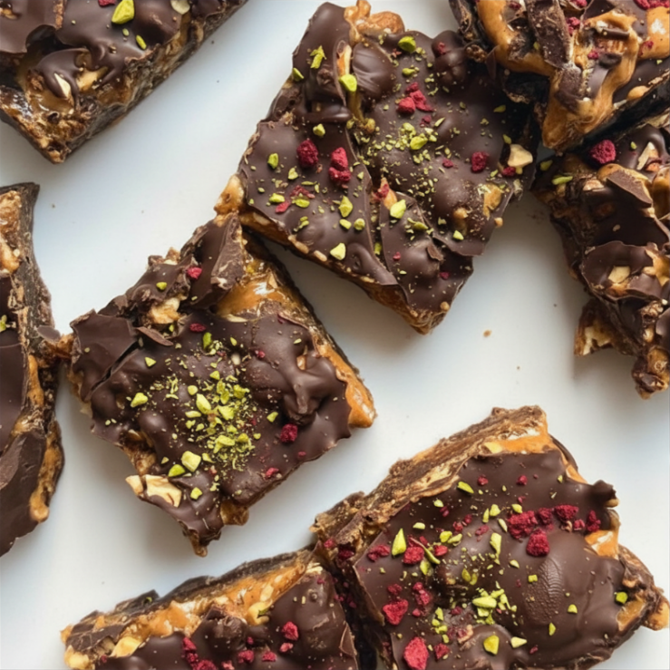 - Drizzle the chocolate mixture over the top of your nut and date bark, and chill in the fridge or freezer until set. Add your optional toppings, and cut into squares to serve. Enjoy!